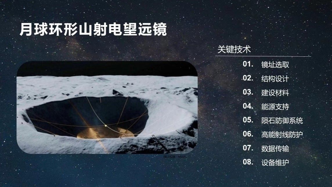 在黑科技专项赛中,由肖飞老师指导的月球环形山射电望远镜项目也拿到了我校在此赛道的最高级别奖,行星级(二等奖)!该项目以中国天眼的概念发展历程和国内外各类大型射电望远镜方案为灵感,提出了一种依托3D打印、深空通讯网络等技术的月背环形山大口径射电望远镜总体方案,可充分利用月背没有无线电干扰的优质观测条件,搜寻来自宇宙深处的微弱信号,探索宇宙起源以及早期的演化。设计方案包括望远镜选址、结构设计、材料选择、能源支持、陨石防御、数据传输等方面。在完成本项目的过程中,小组成员进一步加深了对射电望远镜的了解。