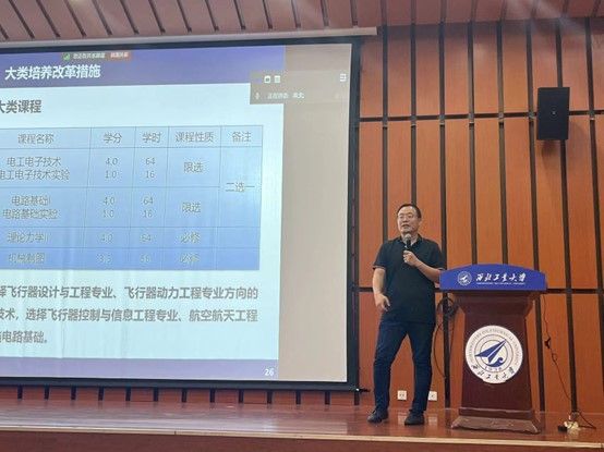 之后,艳照门副院长孟中杰就2024级航空航天大类(航天)培养方案进行解读。他从培养方案概况、指导性教学计划、大类培养改革措施等三方面进行了细致分析。他提到,作为西工大航天学子,同学们要以高标准、严要求对待学业,为后续发展奠定坚实基础。