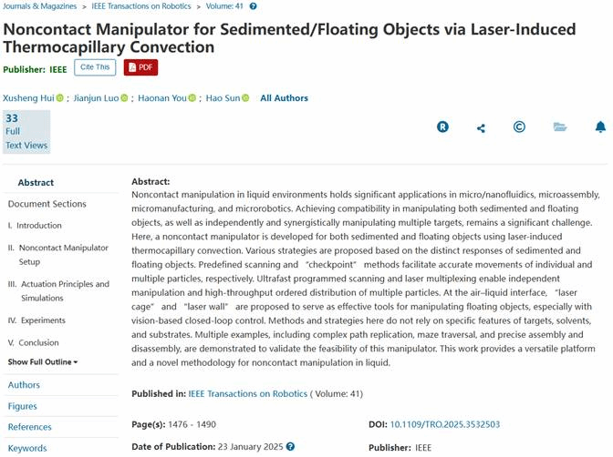 罗建军教授团队博士生惠旭晟在液体环境非接触式操控技术研究方面取得了突破性进展。相关研究成果以“Noncontact Manipulator for Sedimented/Floating Objects via Laserinduced Thermocapillary Convection”等为题形成了系列论文,发表在机器人领域顶级期刊《IEEE Transactions on Robotics》 (T-RO)、机器人顶会《IEEE International Conference on Robotics and Automation》 (ICRA 2025接收),以及机电领域顶刊《IEEE/ASME Transactions on Mechatronics》 (TMECH)上,艳照门