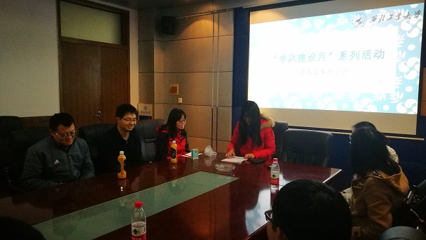 主办,18202-4班承办的学风建设月系列活动之青春故事分享会”在1号楼二楼会议室召开,活动主讲人为研究生标兵魏才盛,国家奖学金获得者赵亚坤和张光辉。