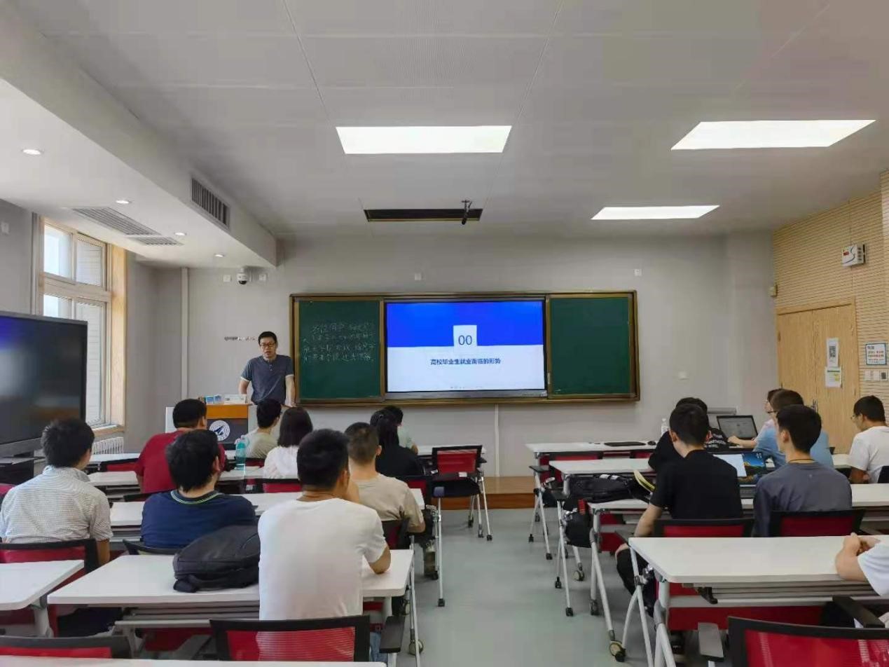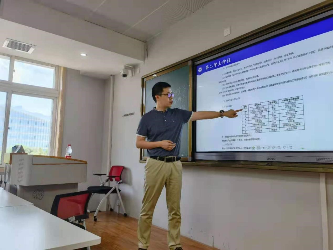 毕业生实际,对比了有业不就和无业可就问题的产生原因,结合航空航天类院所企业的招聘情况,引导大家思考人生方向,做好人生规划。随后,就今年学校关于科研助理和第二学位的政策给同学们进行了详细的讲解,对学校第二学位政策进行深入剖析,鼓励同学们利用好学校的政策。