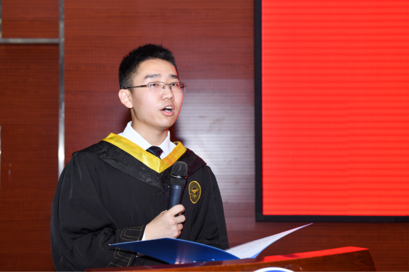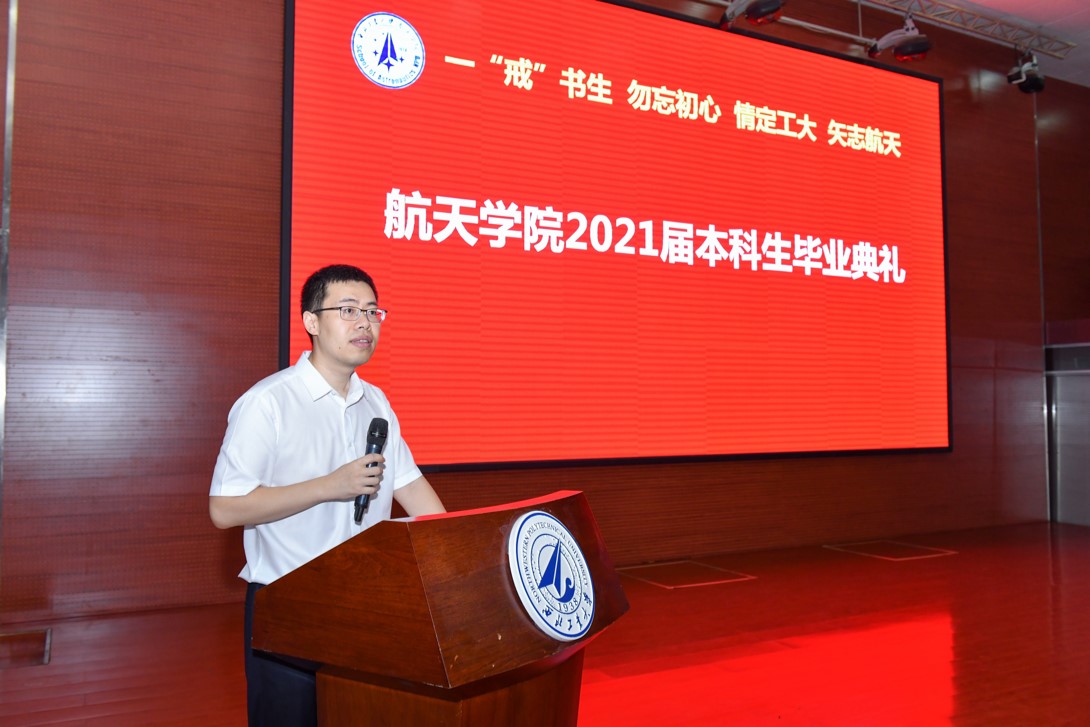 毕业生代表秦伯羽同学发言,表达了对母校的不舍和对师长的感激,向大家献上了自己的毕业祝福,愿身之所往终能到达心之所向的远方,愿大家都能追寻自己的热爱,认识自己的光芒,创造出无限的可能,探索浩瀚宇宙,为祖国的航天事业、为国家崛起和民族复兴贡献自己的力量。