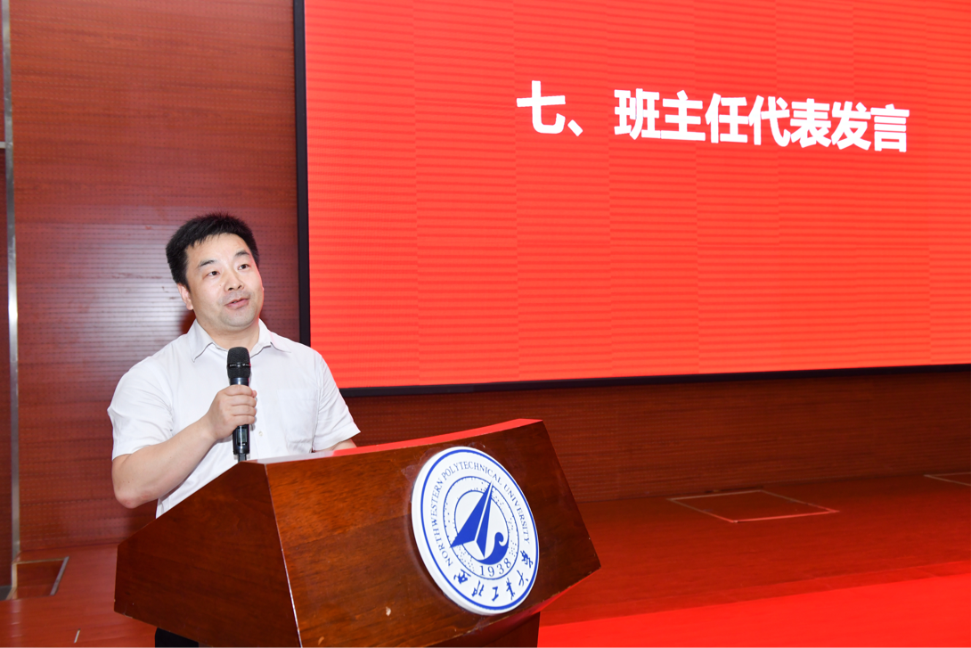 之后,班主任代表闫晓东教授发言,闫晓东教授代表各位教师为同学们送上祝福,祝贺同学们圆满完成本科学业,顺利毕业。他还向同学们叮嘱要用良知去明辨是非、区分善恶,抉择公平与私利;用情怀去爱国家、爱事业、爱家庭;用担当挑起青年的责任、工作的职责和家庭的担子;用勇气去面对挫折、敢为人先、引领创新。