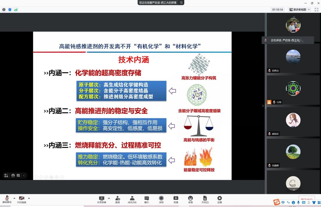 聂洪奇老师针对开设的《推进剂功能材料》课程,结合自身的教育和工作经历及研究方向,详细介绍了课程开设背景及具体授课内容。同时,聂老师以生动形象的语言,介绍了选择推进剂功能材料这门课的理由。