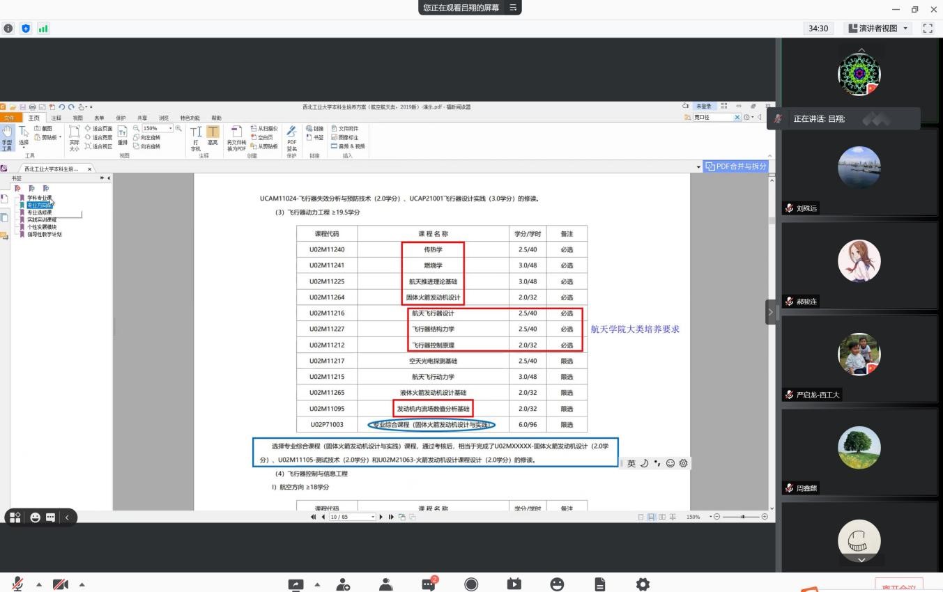 为了帮助同学们更好地了解本专业的培养方案和课程体系,以便合理规划专业课程学习,飞行器动力工程专业建设负责人吕翔老师于2021年8月12日,以线上会议的方式,组织2019级飞动专业全体学生和相关老师开展了以选课指导为主题的培养方案与课程介绍会议。