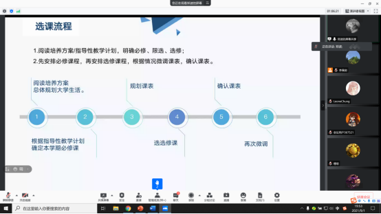 会议第二项由学生注册中心郑波老师为同学们进行选课指导,从为什么选课、选什么课、怎么选课三个方面为2021级同学生动地讲解了选课流程、选课技巧以及合理安排课程,提醒同学们提前做好课程规划。