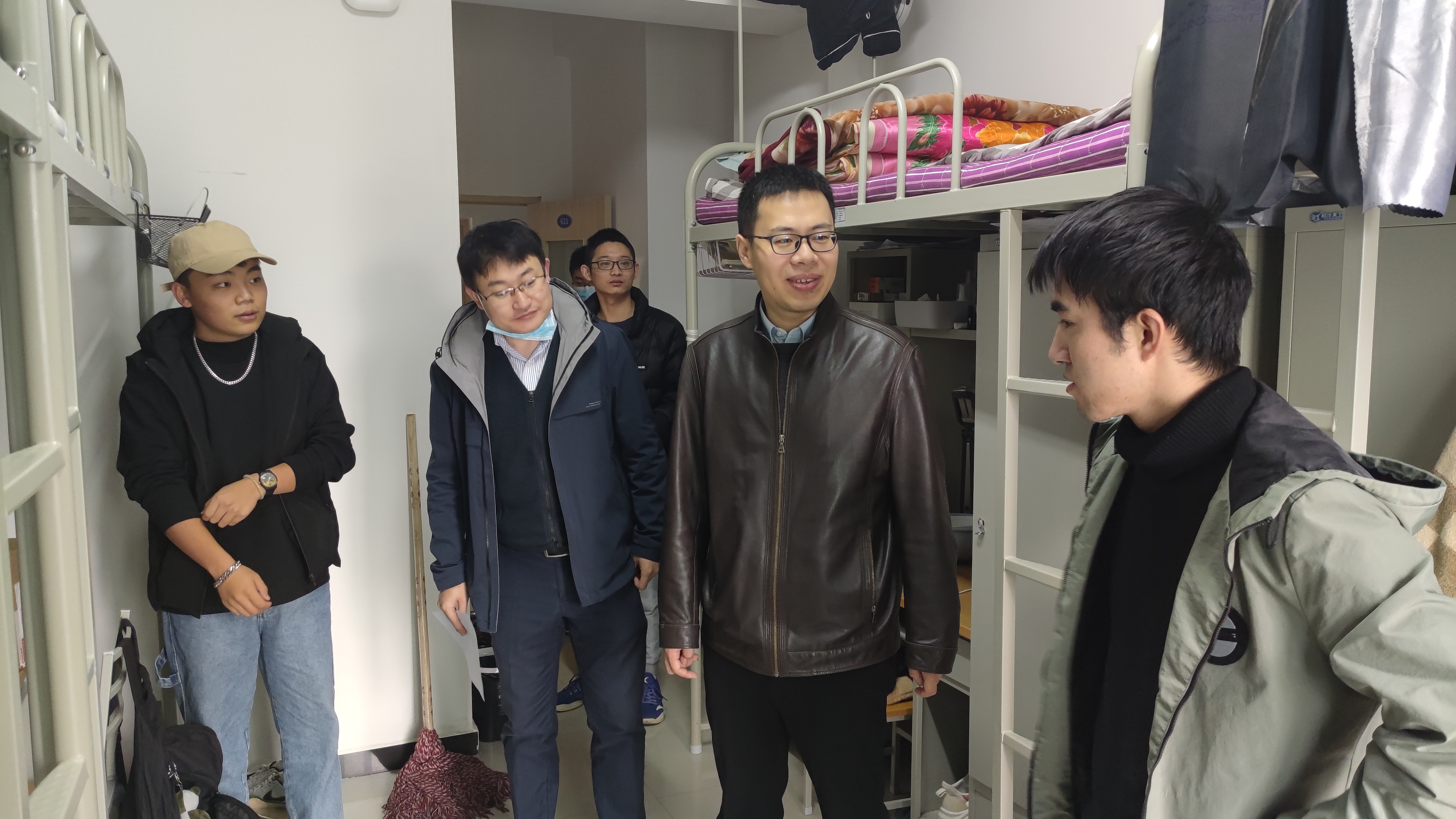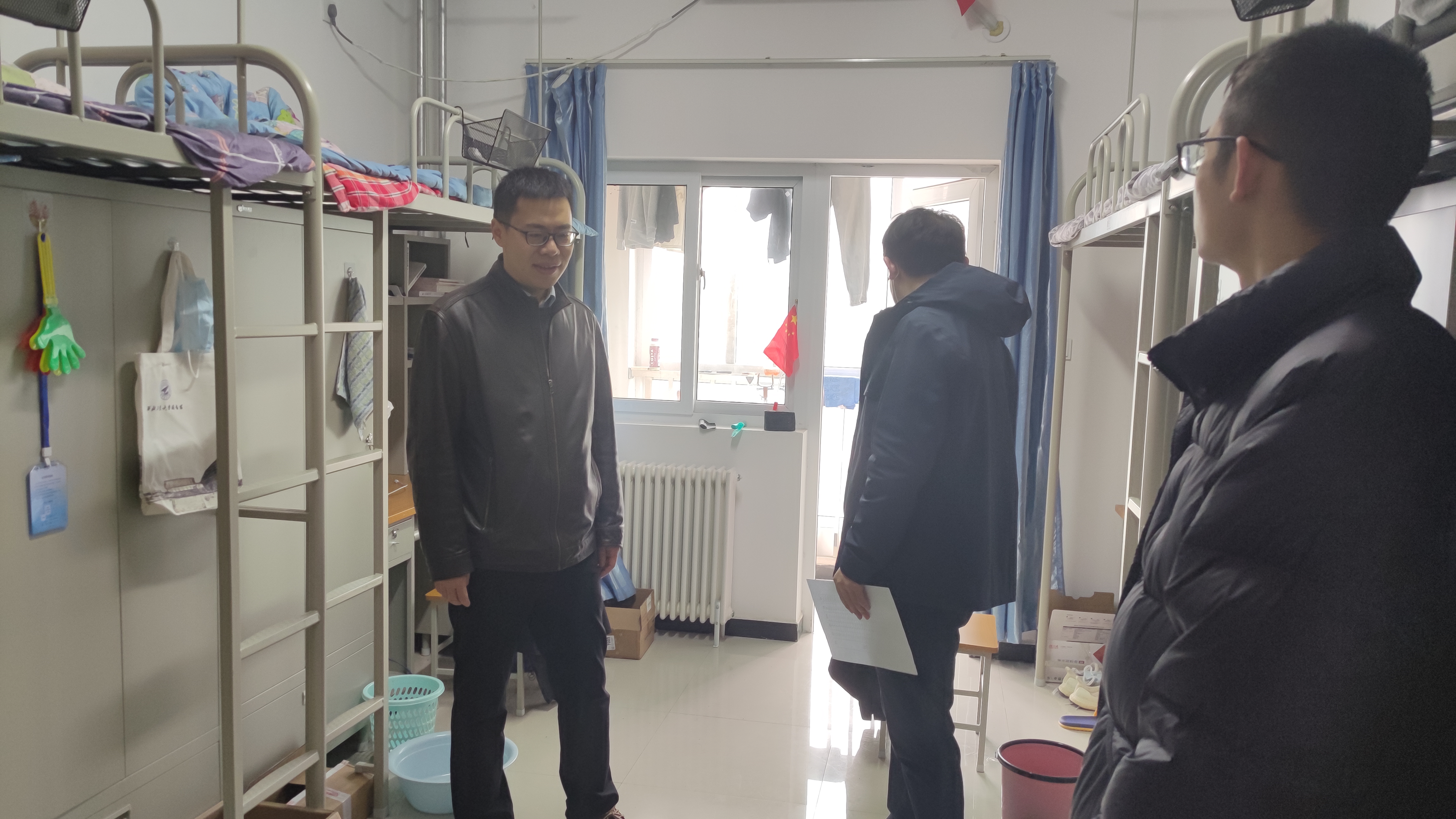 本次检查重点关注研究生宿舍的安全秩序状况,对违规电器使用、不及时断电、吸烟明火等安全隐患进行全面排查,同时对房间卫生状况、室内通风、个人物品摆放等情况进行查看。通过检查,宿舍卫生情况和安全秩序整体较好。韩冬向同学们强调了防火防电安全知识,要求同学们杜绝使用大功率电器,做到“人走电断”,督促大家增强安全意识,及时整改不符合规定的行为做法,切实保证自身生命财产安全,健康生活。此外,韩冬还深入了解学生的学习与生活情况,叮嘱大家要注意疫情防控,坚持填报个人健康每日报,不参加聚集性活动,遇到生活上的困难及时向艳照门老师报告。