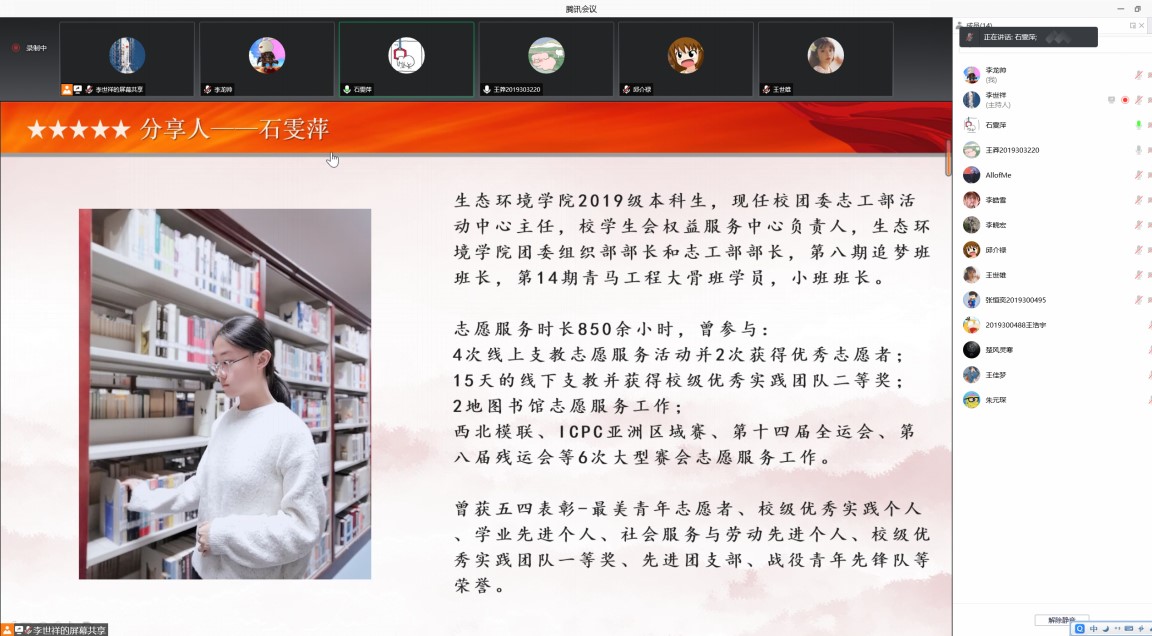 此次的西安疫情来势汹汹、传播面广。然而疫情无情人有情,在这次疫情阻击战中广大青年冲锋在前,发挥了重要作用,他们与广大医护人员一起默默地守护着我们。正如习近平总书记在全国抗击新冠肺炎疫情表彰大会上的讲话中说的“青年一代不怕苦、不畏难、不惧牺牲,用臂膀扛起如山的责任,展现出青春激昂的风采,展现出中华民族的希望!”。目前,班级已有大多数同学作为志愿者参与了学校抗疫阻击战中。为了更好地完成抗疫志愿者工作,此次团日活动邀请到了生态环境艳照门2019级本科生、校团委志工部活动中心主任石雯萍同学为大家分享疫情期间的志愿服务经历和经验。