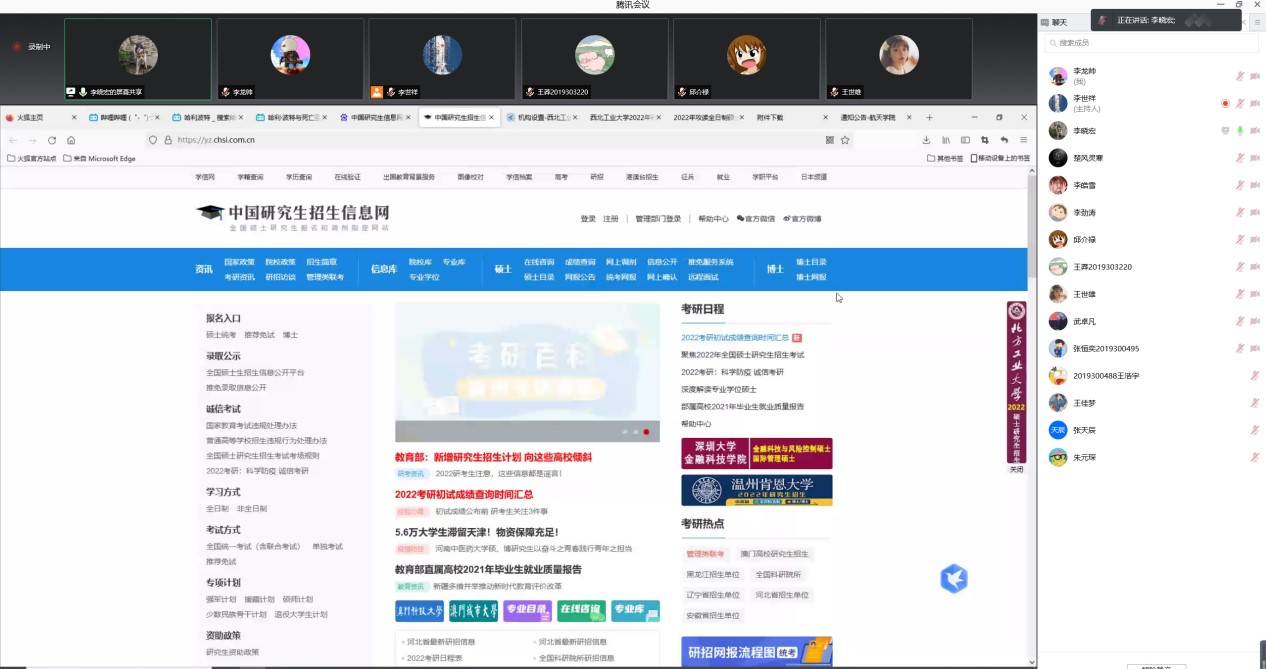 2020级研究生李晓宏、李劲涛和王康同学与大家进行考研备考方面的交流。首先李晓宏同学为大家讲解了考研备考时应当关注的信息以及几个重要的时间节点,之后李劲涛与王康同学和大家分享了考研备考时的经验与心得体会。学长们鼓励大家考研要一鼓作气,绝不能半途而废,遇到困难时要咬牙坚持下去,成功往往属于坚持到最后的人。