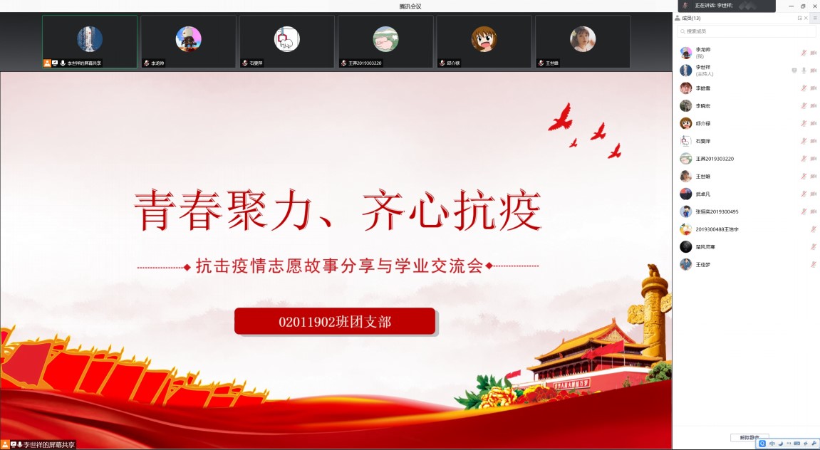 为了加强疫情防控期间班级同学的思想引领,增强大家战胜疫情的信心,弘扬主旋律、传递正能量,同时为了解答同学们学业上的疑惑,02011902班团支部于1月16日晚在线上举办了抗击疫情志愿故事分享与学业交流会,会议由团支书李世祥同学主持。