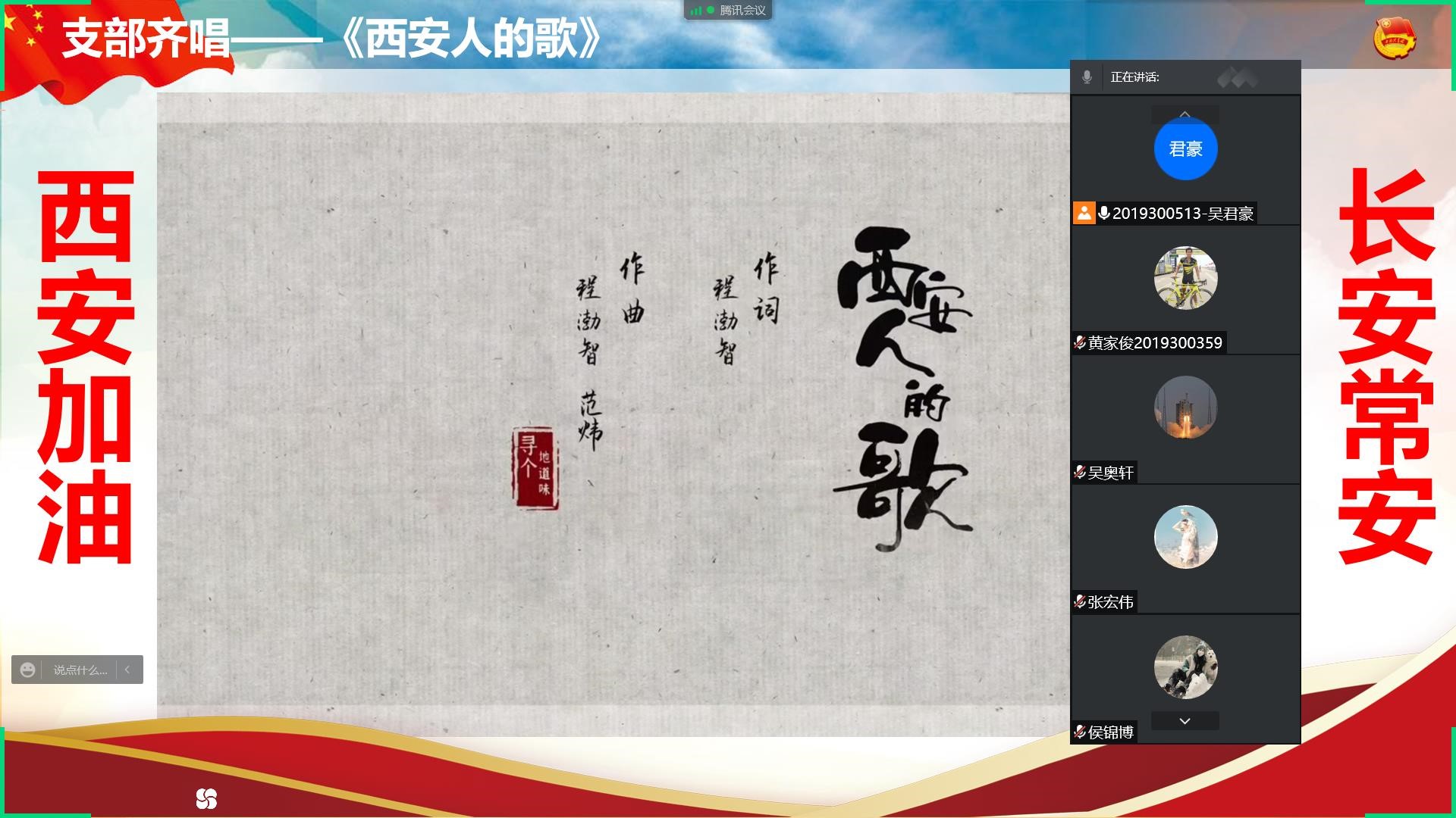 最后,团支部成员在云端齐唱《西安人的歌》,气氛高昂,大家用歌声感谢全国同胞的援助与医护人员的奉献,祝愿长安常安!整场精彩的团日活动也在歌声中落下帷幕。