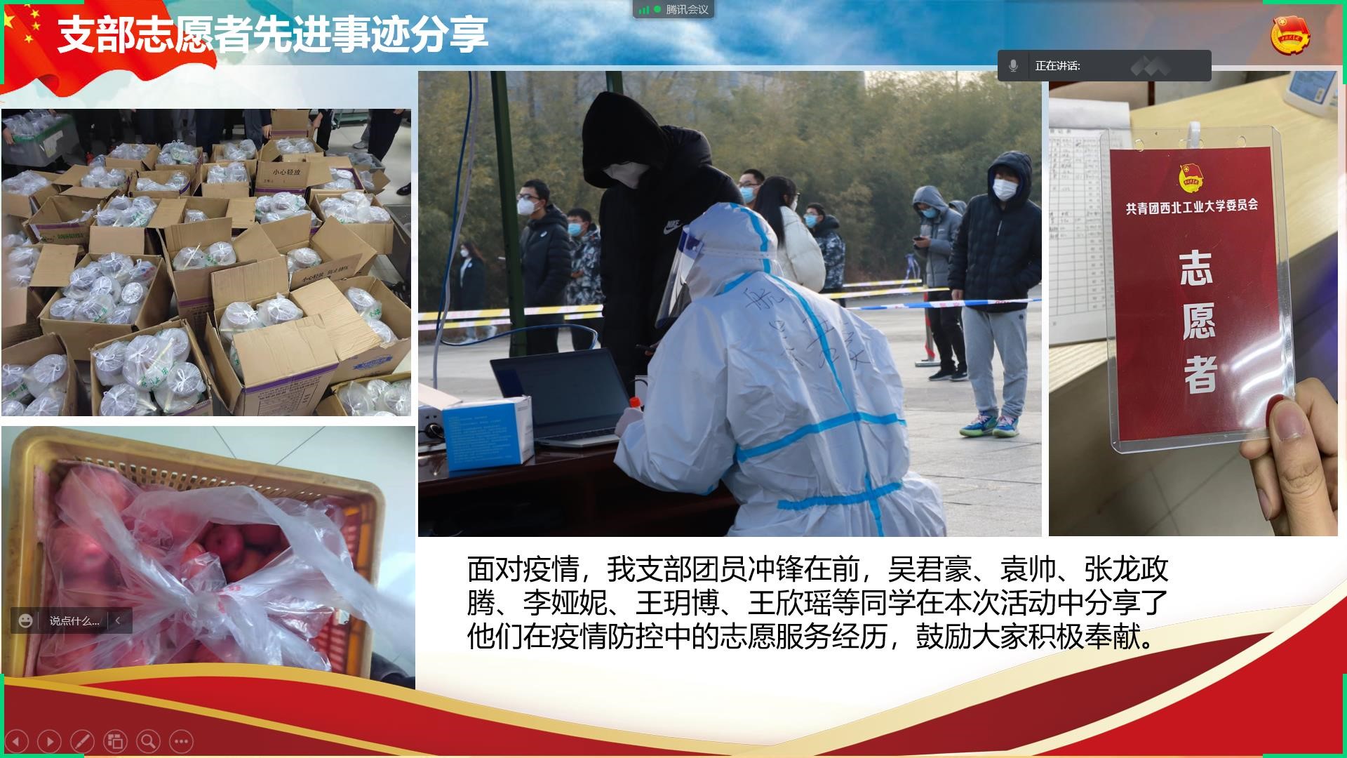 随后,团支部成员吴君豪、袁帅、张龙政腾、李娅妮、王欣瑶、王玥博等同学分享了自己在本次疫情防控志愿活动的故事,鼓励更多同学积极献身防疫工作,用奉献点亮青春!