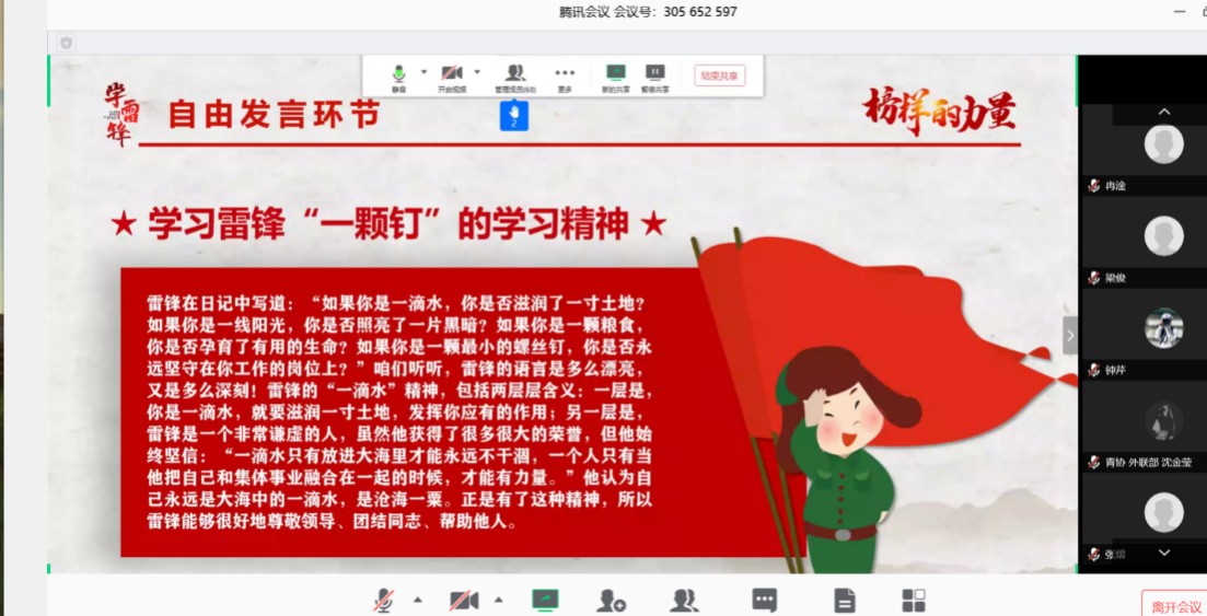 02011903团支部于3月5日暨第59个“学雷锋纪念日”举行了一场学习雷锋精神线上分享会。