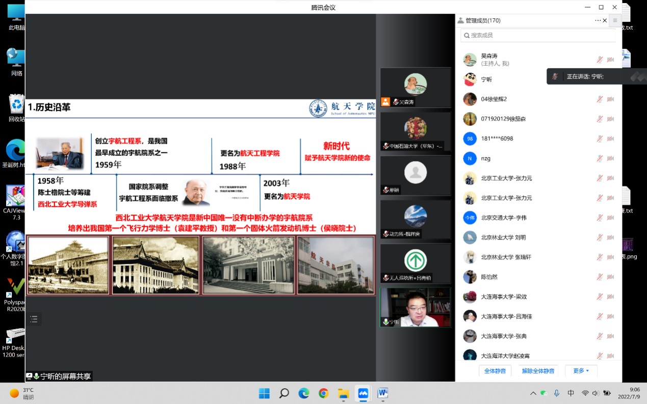 随后,夏令营线上学术报告正式开始,艳照门各研究所的8位老师进行学术报告分享。上午,空天飞行技术研究所的闫晓东老师做了主题为“空天飞行与重复使用”的报告,空天动力技术研究所的魏祥庚老师讲述了火箭冲压组合动力技术研究进展,空间操作技术研究所的马卫华老师介绍了航天飞行动力学与控制研究进展,精准制导与控制研究所的郭建国老师为大家介绍了探月、翱翔系列微小卫星等航天重大工程,报告中讲述的“我们的征途是星辰大海”,让营员们纷纷赞叹“航天人的事业是最浪漫的”。
