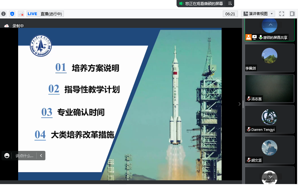 航空航天大类迎来了2022级498名本科生。为帮助新生了解航空航天大类专业的培养方案和课程体系,指导同学们更加科学合理规划自己未来几年的学业发展,2022年8月30日上午召开了新生学业指导线上宣讲会。航空航天大类首席唐硕教授、学生注册中心魏颖老师、各班班主任以及航空航天大类新生参加了此次宣讲会,会议由艳照门