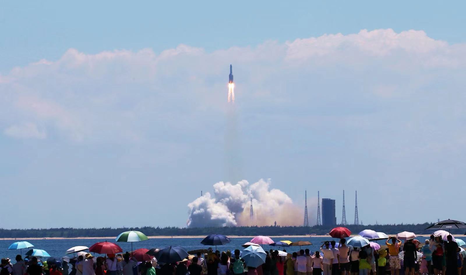我至今仍难以忘却,7月24日那天的早上,文昌市的沙海滩上人山人海,大家不约而同地望向同一个方向——长征5号B火箭的发射塔架。为了能够拍摄出最好的照片,我们一行人提前六个小时便已经就位。当天天气晴朗,万里无云,太阳已经开始灼烧着我们的后颈,我们却一直守在自己的相机旁边,生怕自己一不留神,火箭就已经发射了。下午2:22许,人群中突然开始传来倒计时的声音。我们的心瞬间绷紧,倒计时一结束,我在相机的取景窗里看到火箭下方两团火光闪出,紧接着水气立马腾起,火箭开始缓慢加速。人群中爆发出一阵阵惊叹和欢呼之声,随之而来的便是火箭发出的隆隆响声。只见火箭拖着尾焰,从我们的头顶快速划过,很快就只能看到一团红点,消失在了蓝天之中。在这期间,我唯一记着的事情,就是一直按着相机的快门,生怕错过了哪一瞬间。整个过程不超过2分钟,但是对于我来说又是那么的漫长。回过神来,大家还在津津有味地讨论着刚才的盛况。在片刻的恍惚之后,我突然由衷地感到一种强烈的荣誉感,因为我知道,自己刚刚见证了一个伟大的时刻。