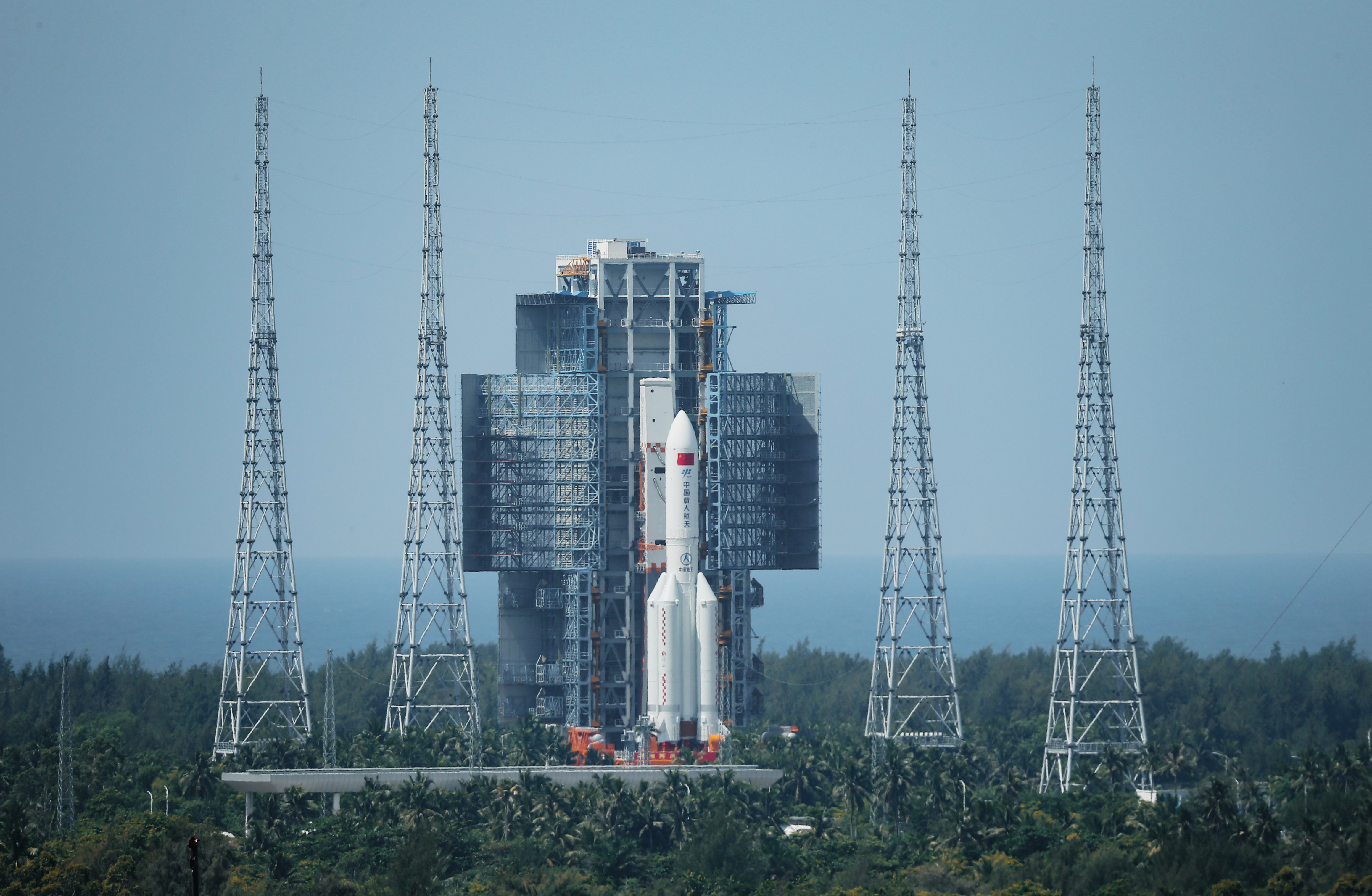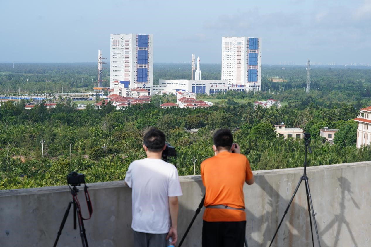 海南用它炎热的天气、美丽的沙滩和成片的椰林热情的迎接了我们。在如此靠近大海的地方进行火箭发射,本身就是一件不可思议的事情。到达龙楼后的第二天,恰逢长征5号B火箭开始转运,我便有了抢先一步一饱眼福的机会。一大早,我们就来到了龙楼镇的一处老年公寓楼顶,在这里不仅可以看到整个龙楼镇的全貌,更是可以清楚地看到几公里外的总装厂和发射塔。架好长枪短炮,我们静静地等待火箭亮相。半个小时后,随着总装厂的大门打开,只见通体洁白体量硕大的“胖五”在轨道上缓缓滑行。