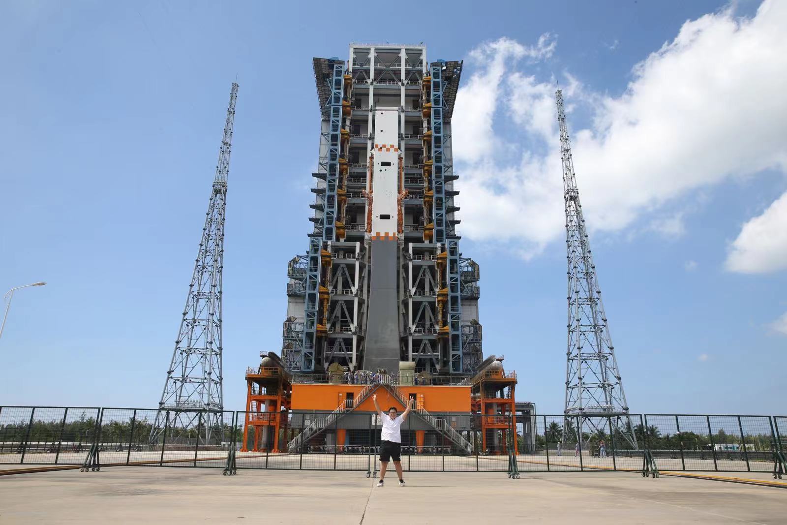 更让我感到惊喜的是,在发射成功后的第二天,我们实践队获得了进入发射场参观的宝贵机会。我们直接来到了火箭的主控大楼,观看本次发射任务的宣传片,听工作人员为我们讲解国家航天事业的未来战略。这种感觉非常奇妙:明明前一天自己还在6公里以外遥望着火箭,今天却已经深入到发射基地里了。下一刻,我们已经站在了发射塔架的下面。除非亲自近距离仰望发射塔,你永远也不会体会到它的雄伟高大。也许在电视上看到的画面,并不能让人真切的体会到它的高度,但是站在发射塔下想象, 20层楼高的长征5号B火箭从这里腾空而起,瞬间就会体会到自己的渺小。