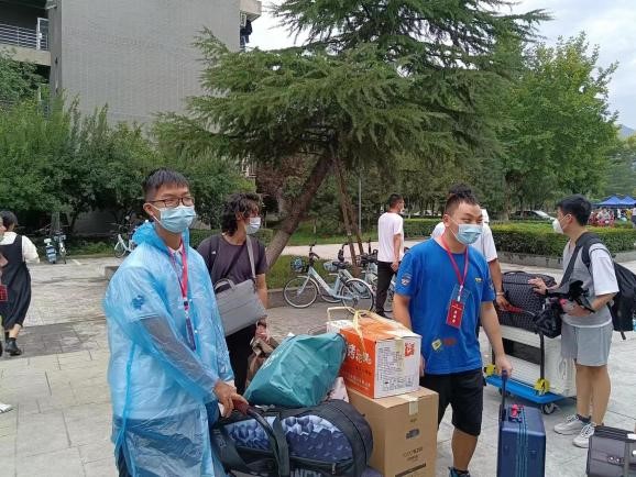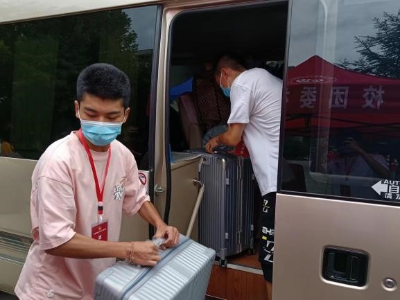 在当前的疫情防控形势下,新生入校须在大东门验查核酸证明、健康码和行程码,随后乘坐转运车前往各个宿舍楼停靠点。汗水打湿衣衫,口罩难掩真诚,志愿者们热心帮助新生转运行李,以真心待真心,在微凉的秋天足以慰人心。
