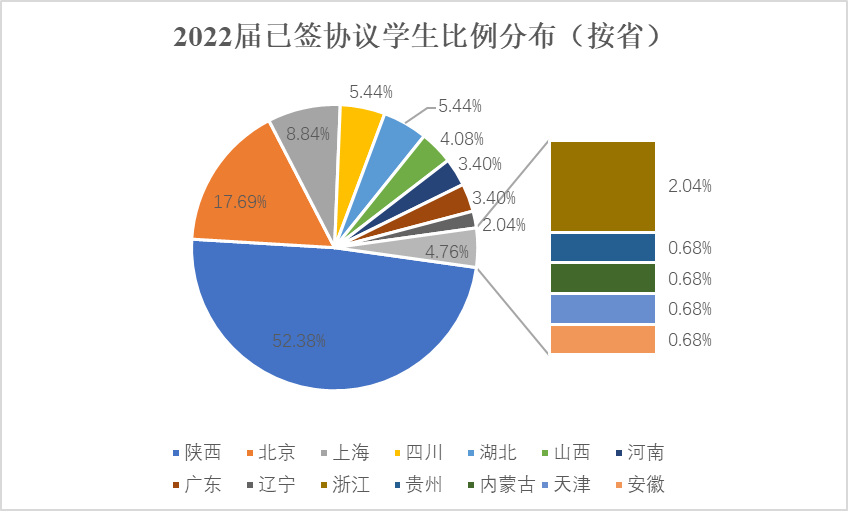 从就业单位地域来看,留在陕西的学生居多,其次为北京、上海等一线城市,然后为新一线城市所在省份,如四川、湖北、河南、广东等。就业地域分布如下图所示: