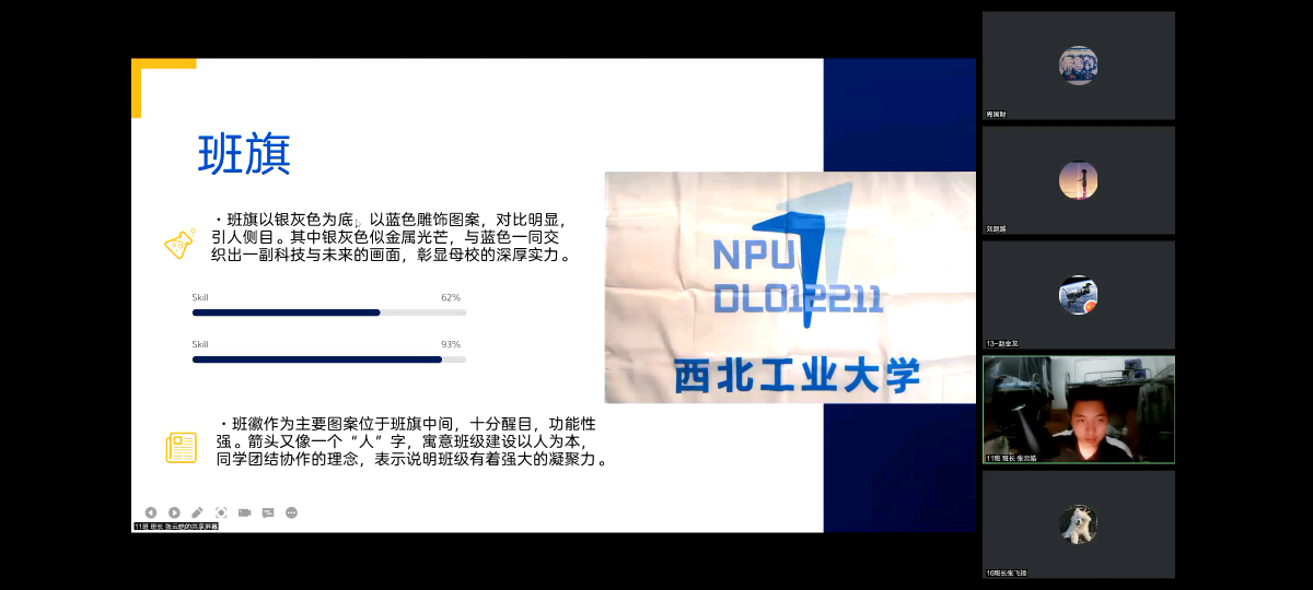 11班旗,“以银灰色为底,以蓝色雕饰图案,对比明显引人侧目。其中银灰色似金属光芒,与蓝色一同交织出一副科技与未来的画面,彰显母校的深厚实力。”