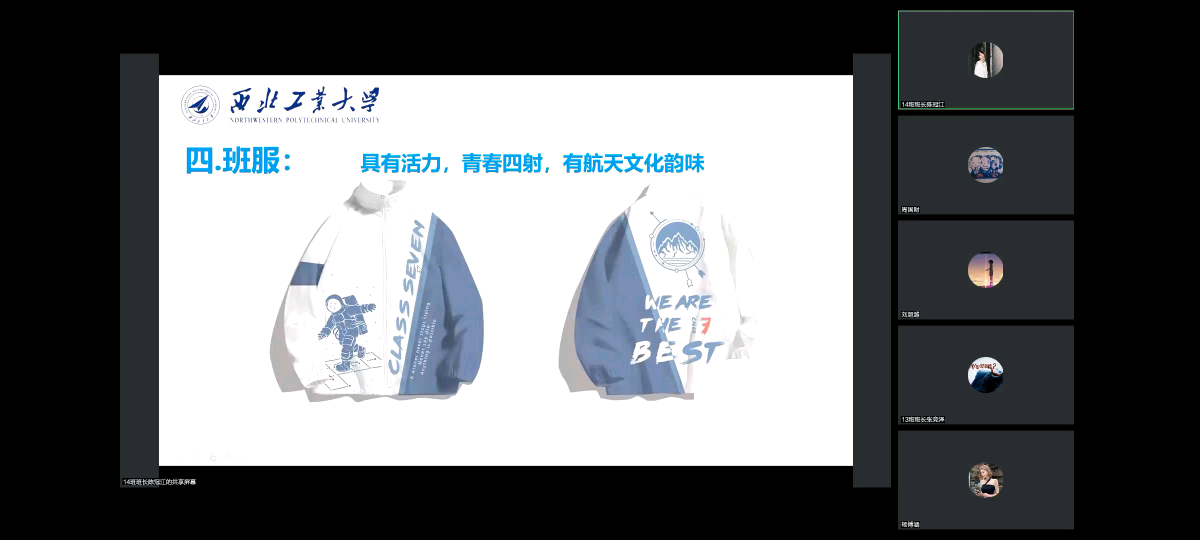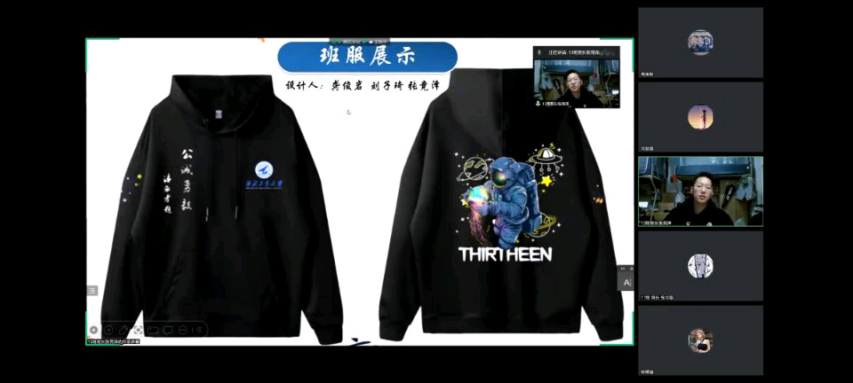 14班班服:“采用雾霾蓝和奶油白大胆的拼接撞色,点缀宇航员和秦岭的元素,突出14班成员,甘做秦岭脚下航天人的特点。”