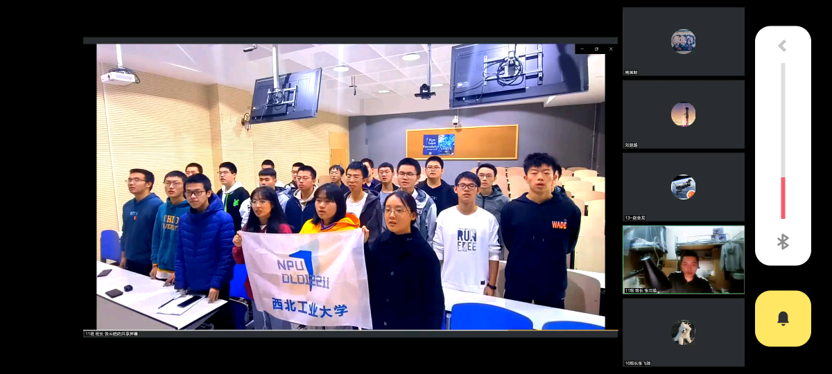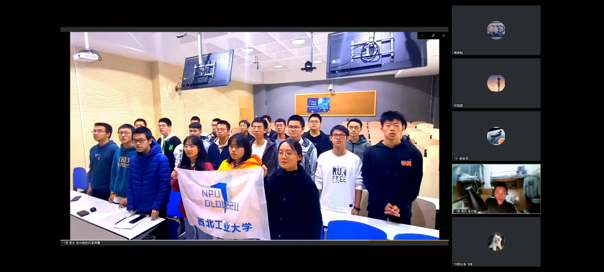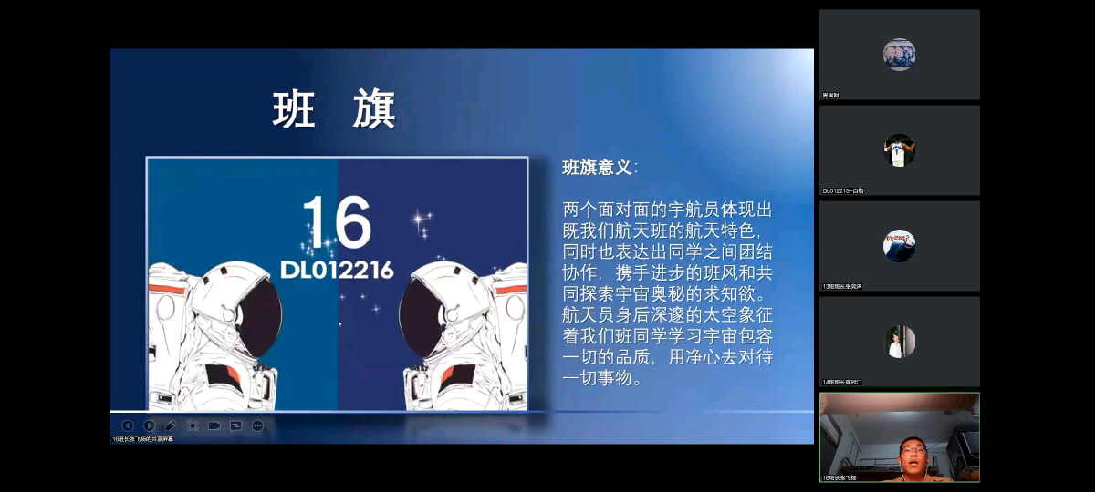 16班班旗,“两位面对面的宇航员既体现航天特色,同时也表达出团结协作、携手进步的班风和共同探索宇宙奥秘的求知欲。航天员身后深邃的太空象征着我们班同学学习宇宙包容一切的品质,用静心去对待一切事物。”