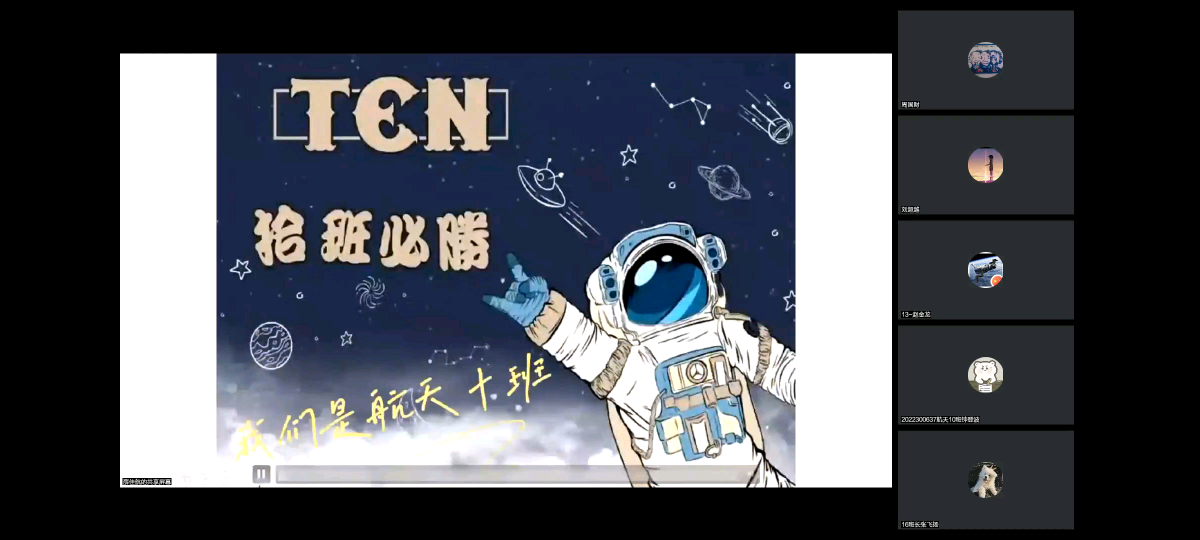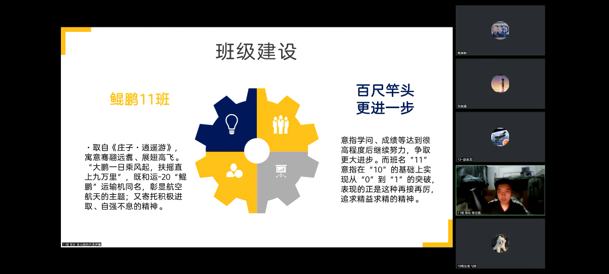 10班班旗,“以浩瀚银河为底色,万千星辰为点缀,苍穹之上的宇航员代表着十班同学直上云霄的志气,显示我们投身航天,为祖国做出贡献的决心。”