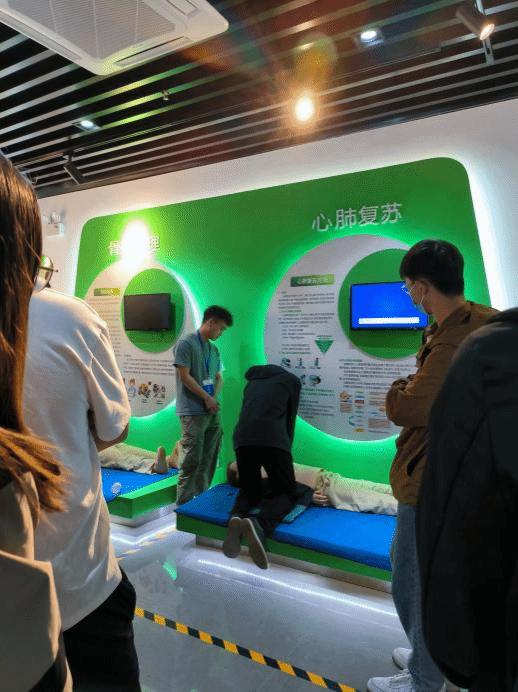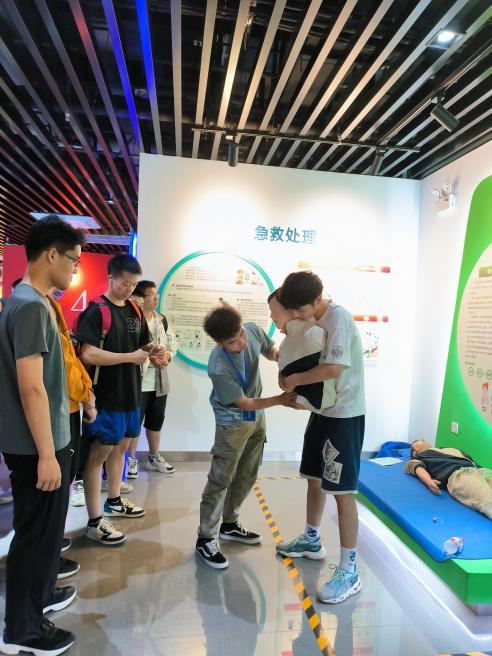 在讲解人员的带领下,师生们先后观摩了安全教育体验馆的自然灾害、消防安全、校园安全、卫生健康、交通安全五个展区。参观过程中,讲解员细致地介绍了馆内每一个互动体验模块中涵盖的安全知识和应对方法,指导大家现场进行海姆利克急救、心肺复苏、灭火演练、交通安全VR体验等各种紧急情况下的应急处置实操训练。使在场人员沉浸式体验自然灾害和危险来临时的紧迫氛围,掌握应急逃生和自救互救知识,身临其境感受到灾害降临时应如何沉着冷静、准确快速地应对。
