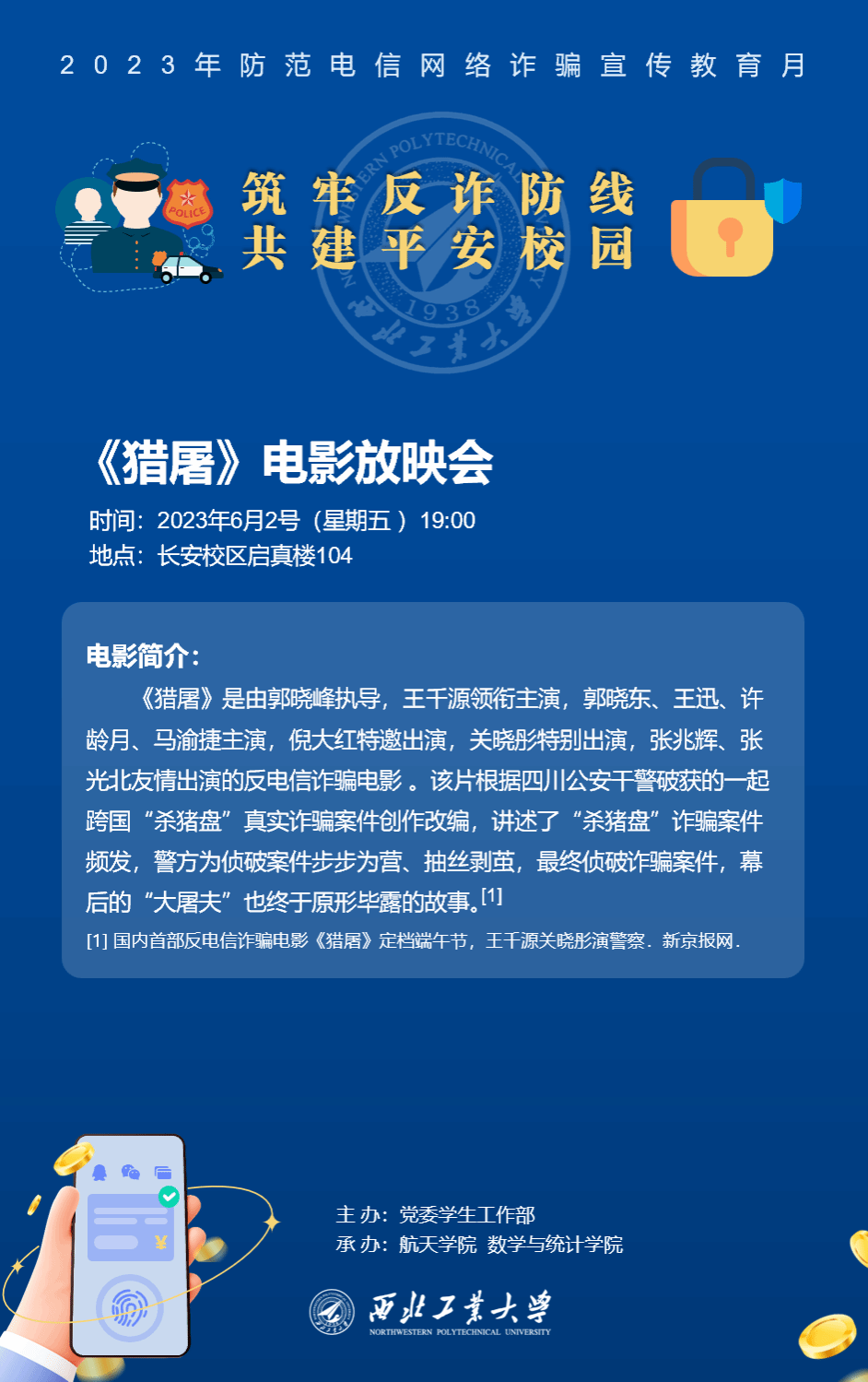 时刻紧绷防范之弦,谨防新型电信诈骗,学会如何辨别与预防诈骗刻不容缓。航小天邀您参与本次《猎屠》放映会,筑牢你我心中的反诈防线,共同建设平安校园。